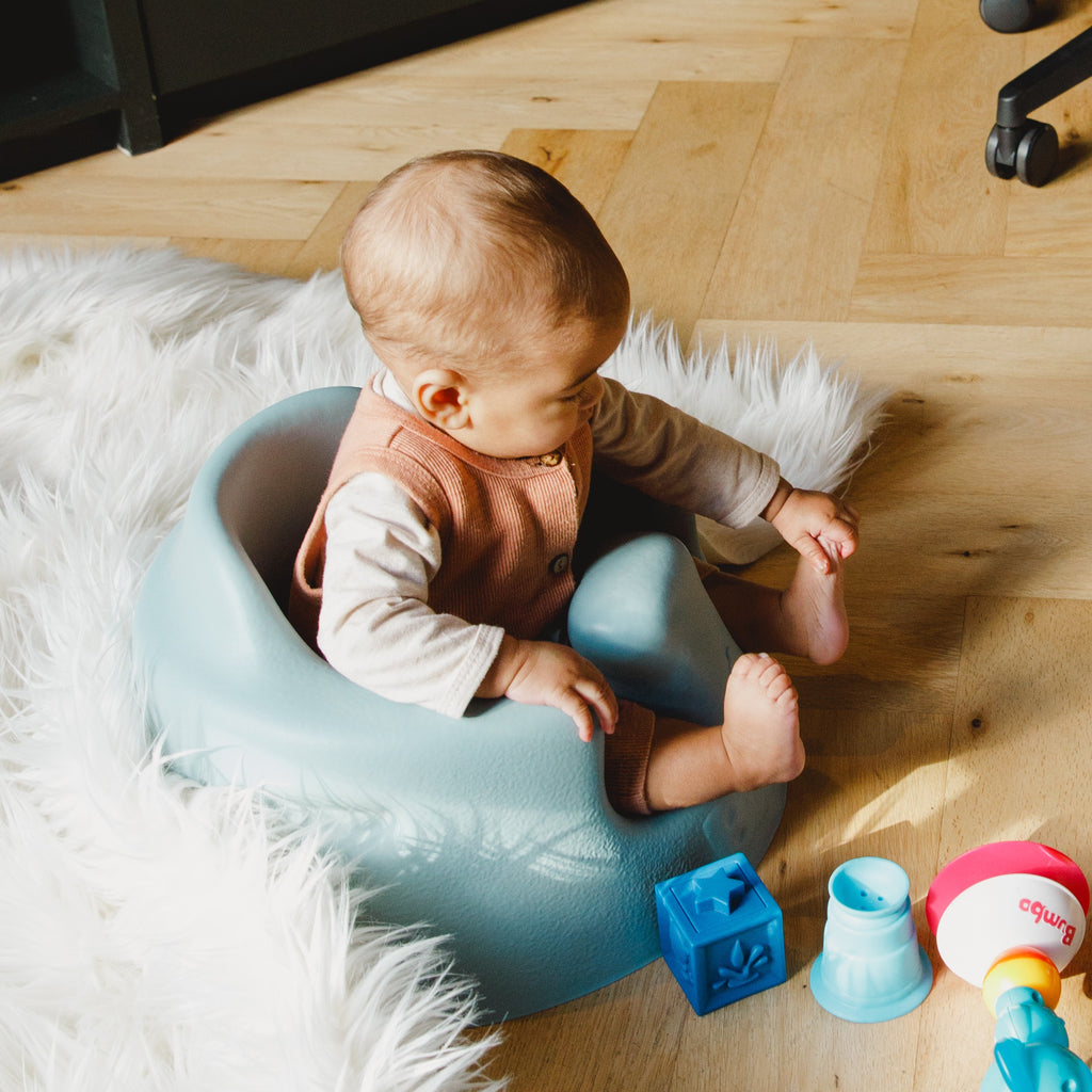 赤ちゃんが座るとオリジナルのバンボカーブが体に沿って背中やおしりを包み込んで、はじめてのおすわりをサポートします。